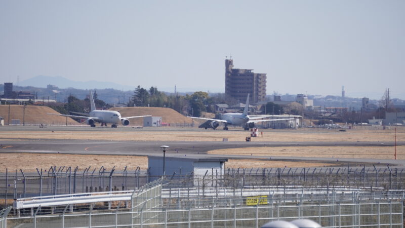 神明公園からは滑走路を挟んだ、かなり遠い格納庫の前に空中給油機KC767とKC46Aが重なって見えます。