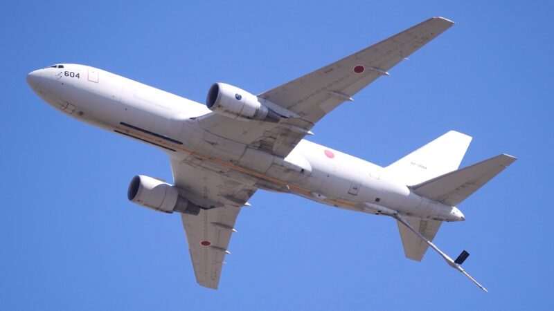 KC-46A(ボーイング社)の4号機、航空自衛隊美保基地(鳥取県)の第405飛行隊所属の空中給油機、全幅48.1m、全長50.5m、全高15.9m、最大離陸重量188,240kg、最大速度マッハ0.86(915km/h)、巡航速度マッハ0.80(851km/h)、航続距離12,200km、乗員3名