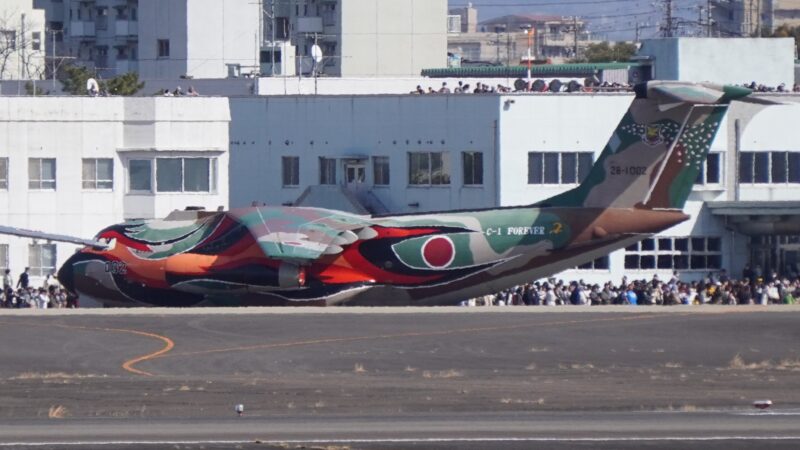 C-1輸送機の試作2号機(28-1002)に永遠に飛び続けるとの願いを込めて、「フェニックス(不死鳥)」をモチーフにした特別塗装を施した入間基地のC-1の2号機(まるで歌舞伎の隈取のようなド派手な塗装、C1は国産輸送機として開発され昭和45年に初飛行、試作機を含む31機が製造されたが2025年に全機退役が決まっている、2号機は2025年3月14日に入間基地でラストフライト)