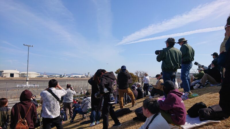 天気予報によると本番の翌3月2日は曇りの予報で降水確率も40%程です、天気の良い前日の方が良いと思い小牧基地に来てみると、前日にもかかわらず、多くの航空ファンが詰めかけていました。(みんなすごいカメラ持ってます)