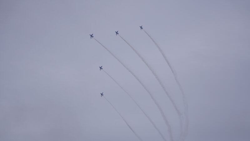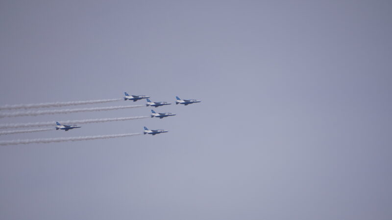 AIRPORT WALKの文字の向うに小さく見えるブルーインパルス、どれくらい離れてるんだろう?