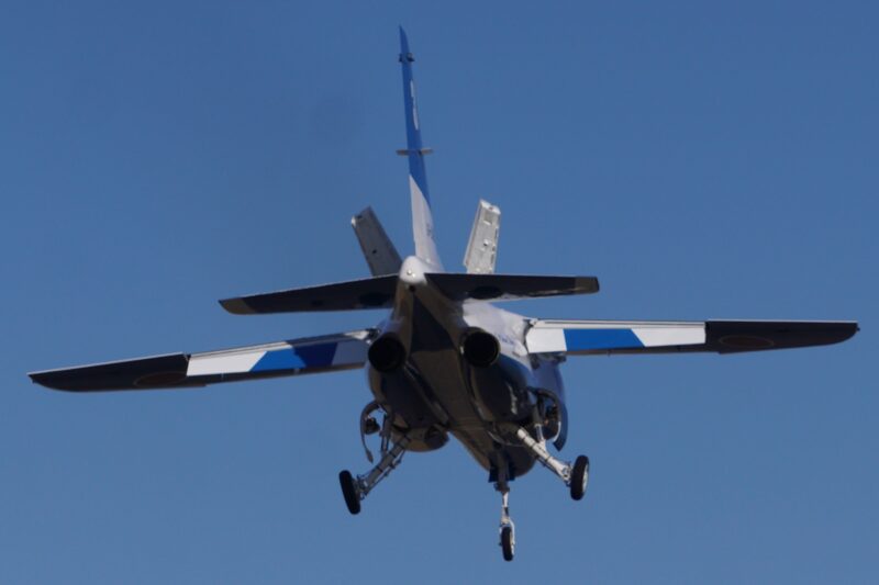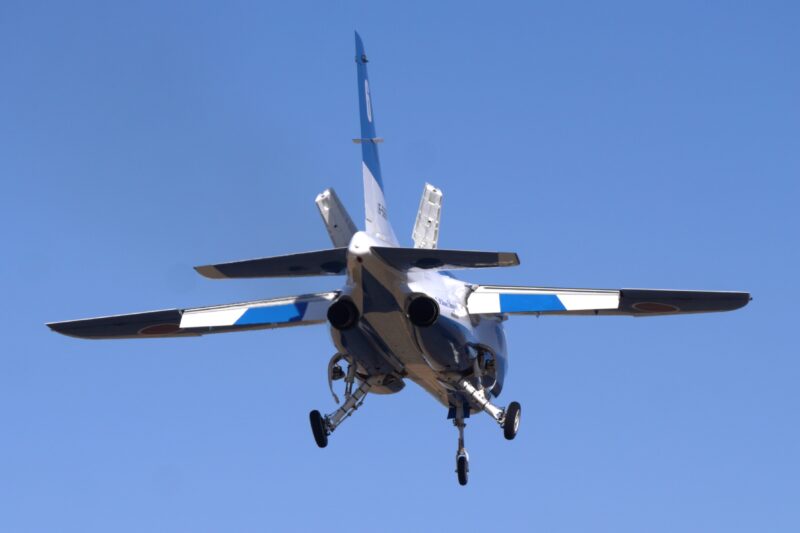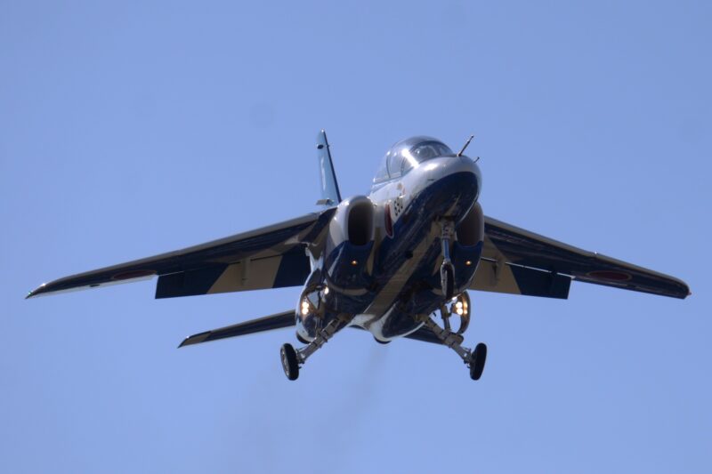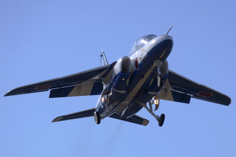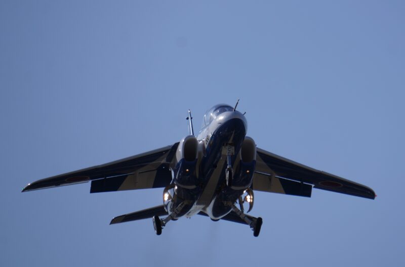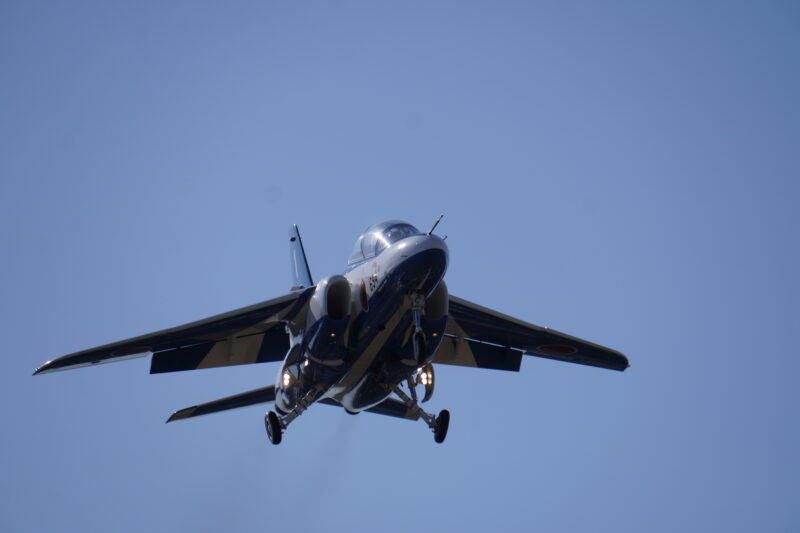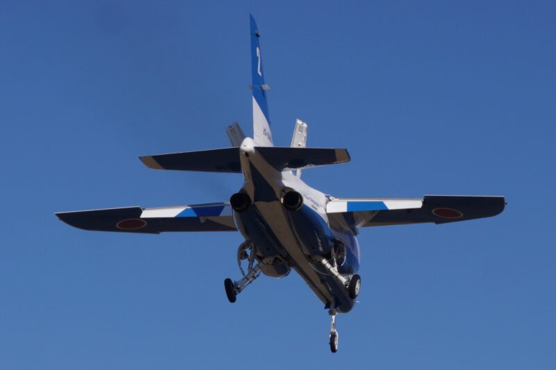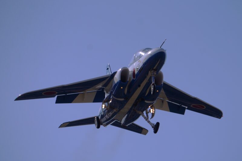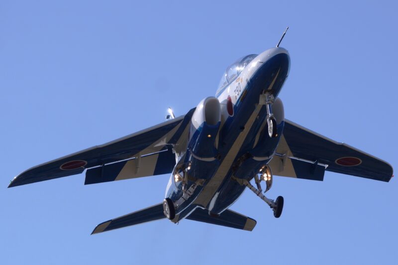 ブルーインパルスで使用される機体は現在、T‐4練習機で「戦技研究仕様機」と呼ばれ、スモーク発生装置や、アクロバット飛行の為に計器の追加に加え、低空での飛行が多いためバードストライクに備え風防はノーマル機より2倍ほどの厚みになっていたり、主翼の一部が強化されているとか。