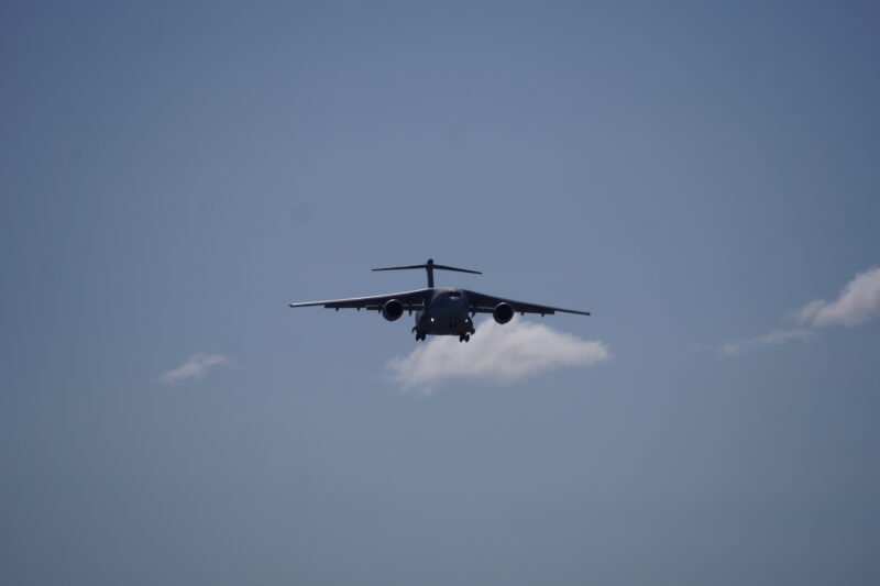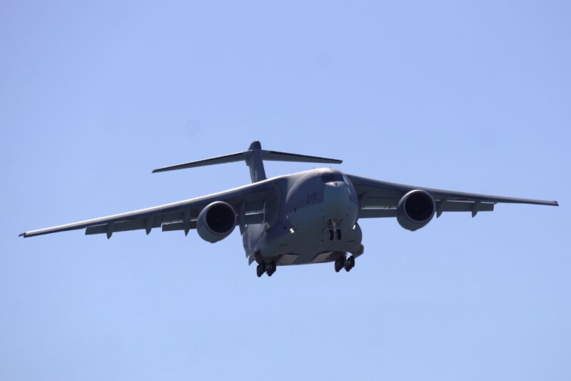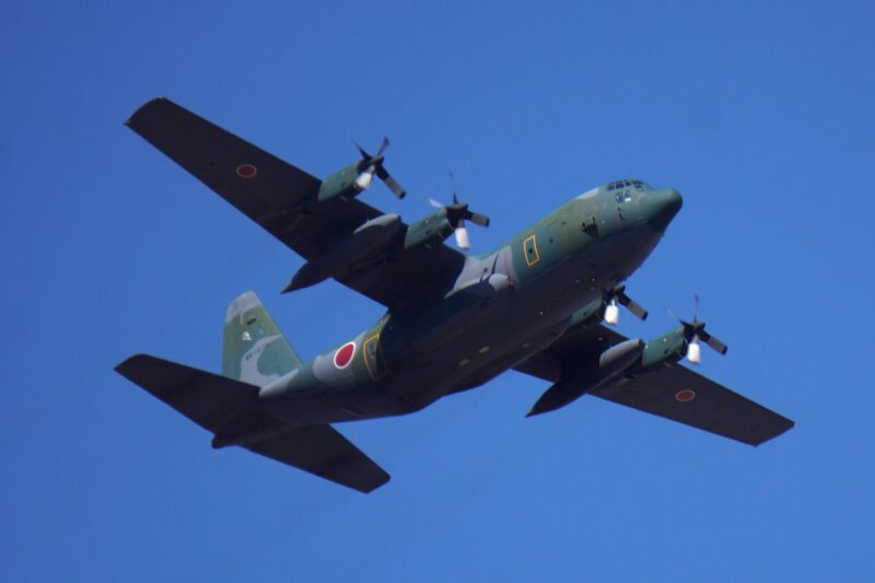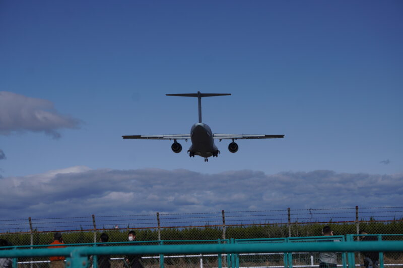 機体の色が黒いので軍用機の迫力がある。普段は鳥取県境港市の航空自衛隊「美保基地」に配備され「第三輸送航空隊」に所属する。航続距離は約9,400kmなので、名古屋なんて近所なのかな?