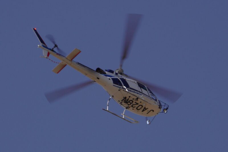 中日本航空のエアバス・ヘリコプターズAS350B3と言うヘリコプター。最高速度258km/h、巡航速度200km/hで飛んでいく、何のお仕事してるの?