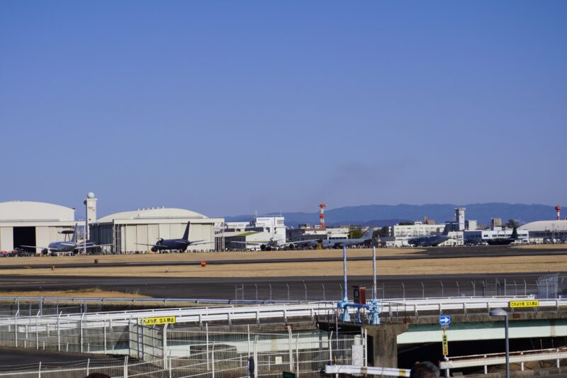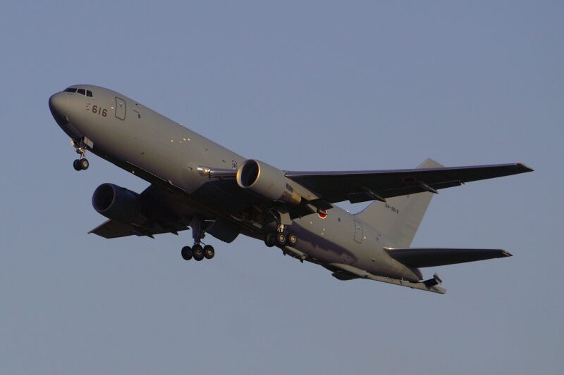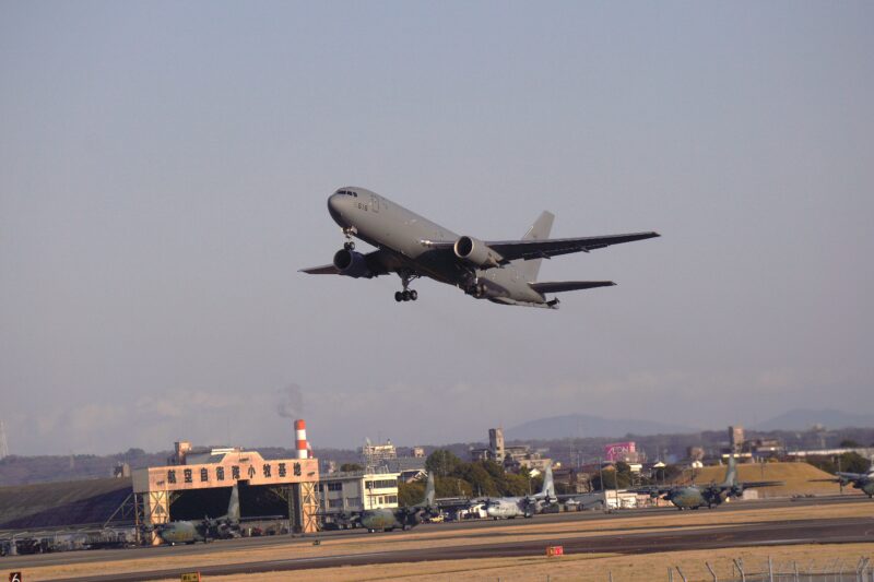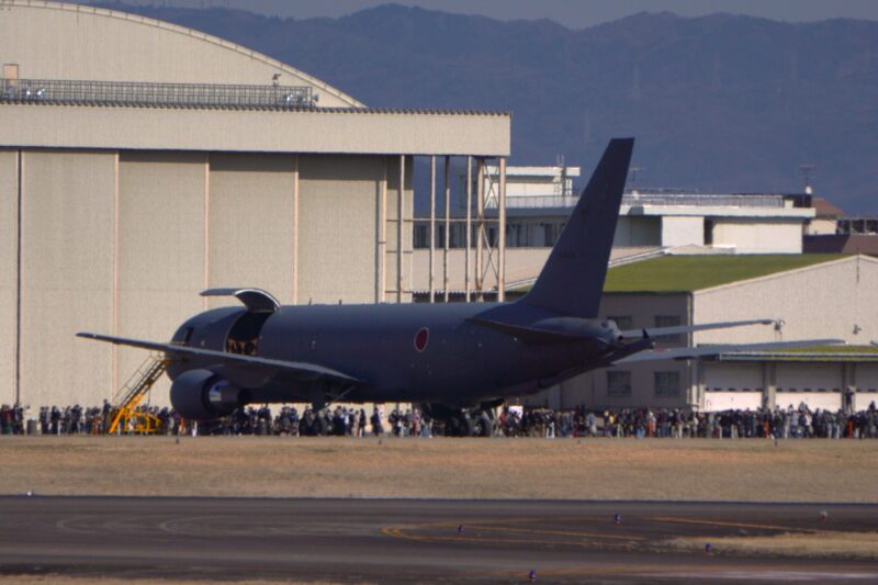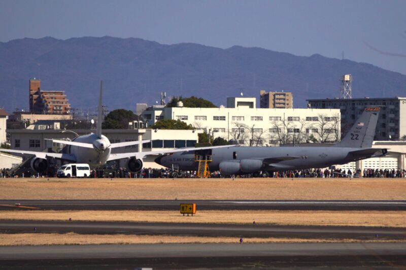 左側にKCー767、右側のアメリカ空軍・KCー135(ストラトタンカー)は嘉手納基地所属、日米の空中給油・輸送機が並んでいます。