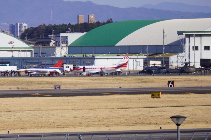 白い機体が並んでいます、赤い垂直尾翼のFー2の後ろに航空自衛隊の飛行点検機U-680A、その後ろにヘリコプターが展示されているのが確認できますが、さすがに遠い。