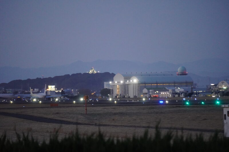 小牧基地の向うに見えるのは、小牧山にそびえる小牧城がライトアップされています。