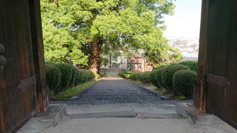 後日、山門に行ったときの写真、朝日で逆光になってしまった。扁額には瑞泉寺の山号の青龍山の文字が(2024.6.14 撮影)