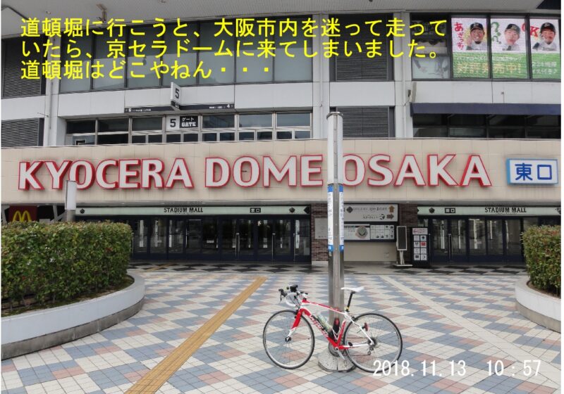 道頓堀は有名なので、どこかに標識があるだろうと走っていたら京セラドームに着いてしまいました。こんなところにあるんだね(ここに来るまで地理がわからず、走り回ってました)