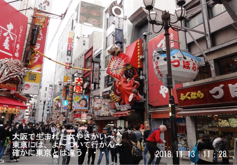 このごちゃごちゃした下町感と人混み、関西弁と強烈な看板が道頓堀の特徴、東京にはない景色。
