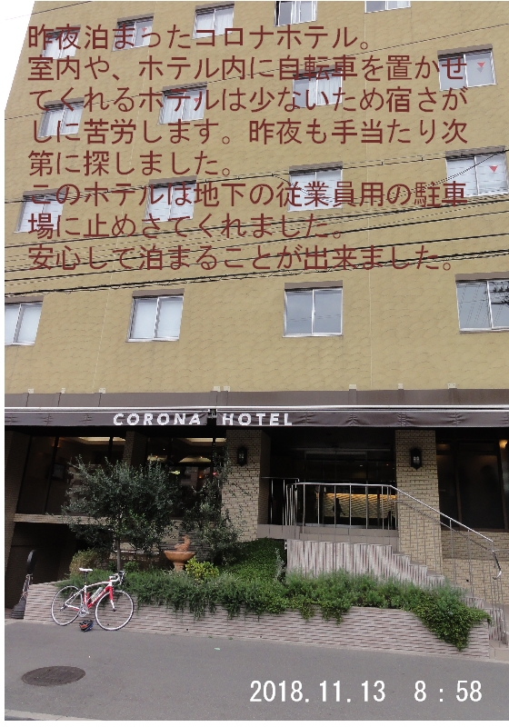 とっても親切にしてくれたコロナホテル、この数年後のコロナ禍で風評被害を受けることになるなんて、このときは想像もしていませんでした。
