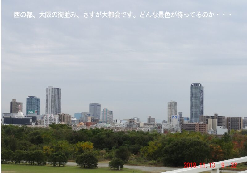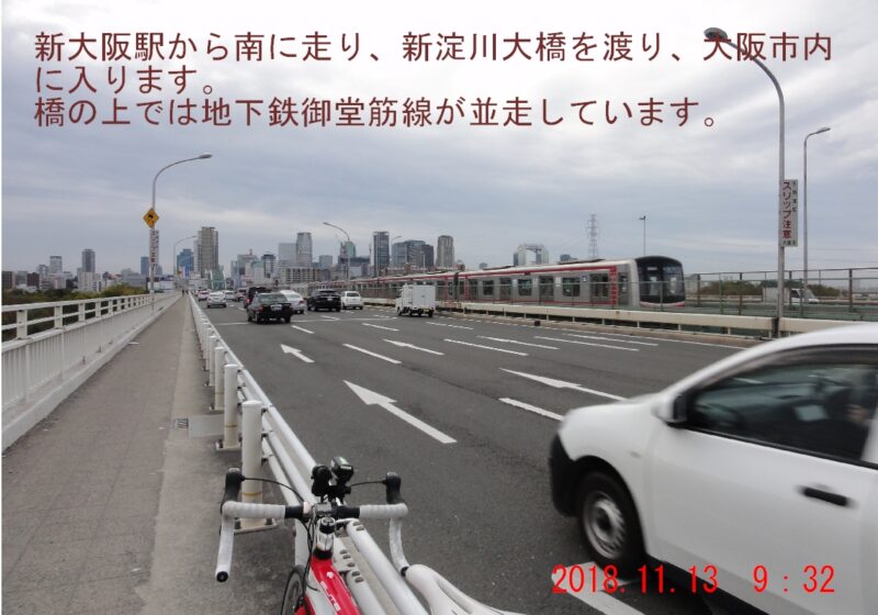 橋を渡っていると中央部分を電車が通り過ぎて行きました、見た時は普通の電車だと思っていたら、それが御堂筋線でした(実は地下鉄の御堂筋線が地上を走るのを知りませんでした)