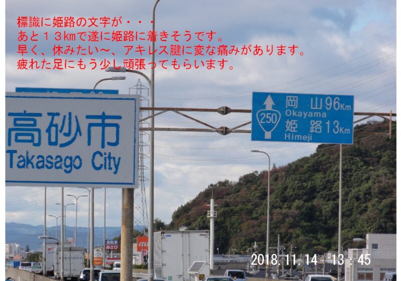 あと13kmの所まで来たじゃん、あとちょっとで姫路、でも足も痛くなってきたんだ、片足でかばいながら漕ぎました。(岡山は遠いんだね・・・96kmもある)