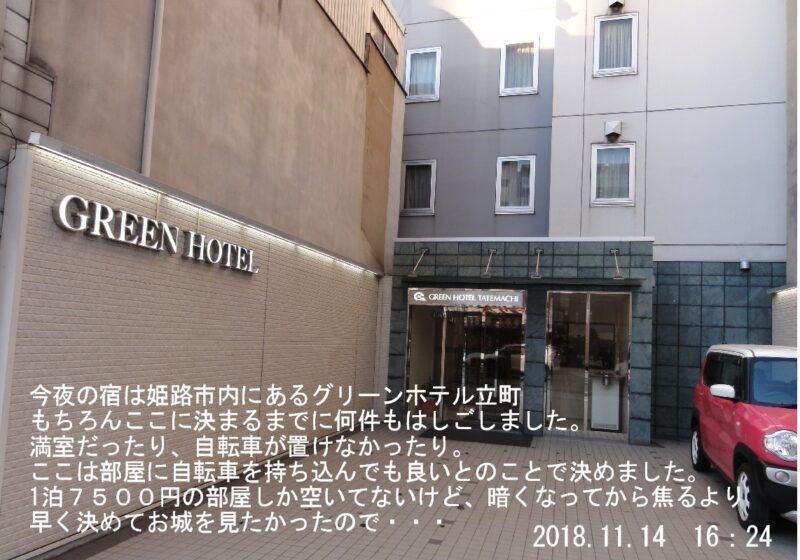 姫路での宿は「グリーンホテル立町」、毎度のことですが宿選びは悩ましく、なかなか決まりませんでした。でも、ここは最高でした、明るいうちに決まって一安心です。