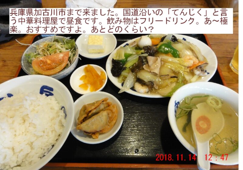 西に向かう国道は飲食店も多く、どこで食べようか迷います。見知らぬ土地に行くと、全国チェーン店ではない店を選ぶことが多いのですが、「てんじく」と言う店は見たこと無かったので入ってみました。