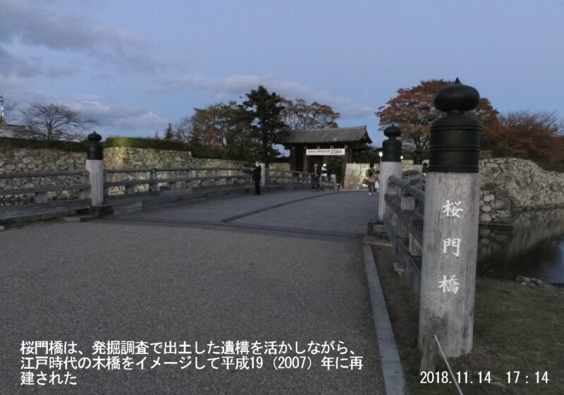 桜門橋は木橋をイメージして、幅7メートル、長さ22メートルのコンクリート製の橋に木造に見えるように加工してある。それは、消防車などの重量に耐えられるようにする必要があるためとか。
