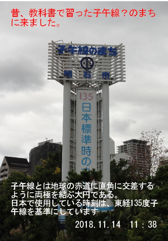 帰宅後調べると、中国の古い時代では方角を十二支で表し、北を「子(ね)」南を「午(うま)」と呼び、真北と真南を結んだ線が子午線となる。世界では各国の時間の基準となる場所を決めることになり、日本では明石市の上を通過する東経135度が選ばれ、日本標準時となっているようです。(明治初期には、経度の違いにより東京時刻と大阪時刻があったとか)