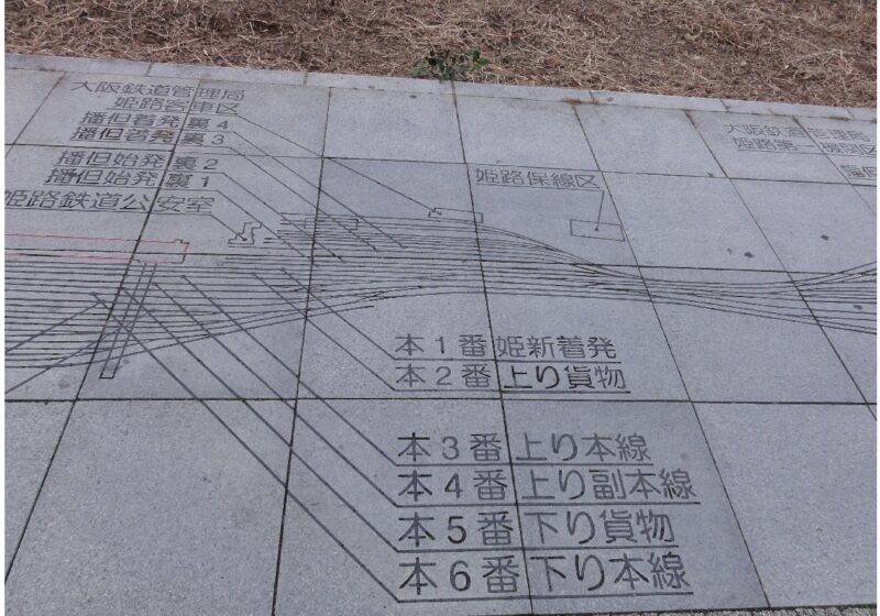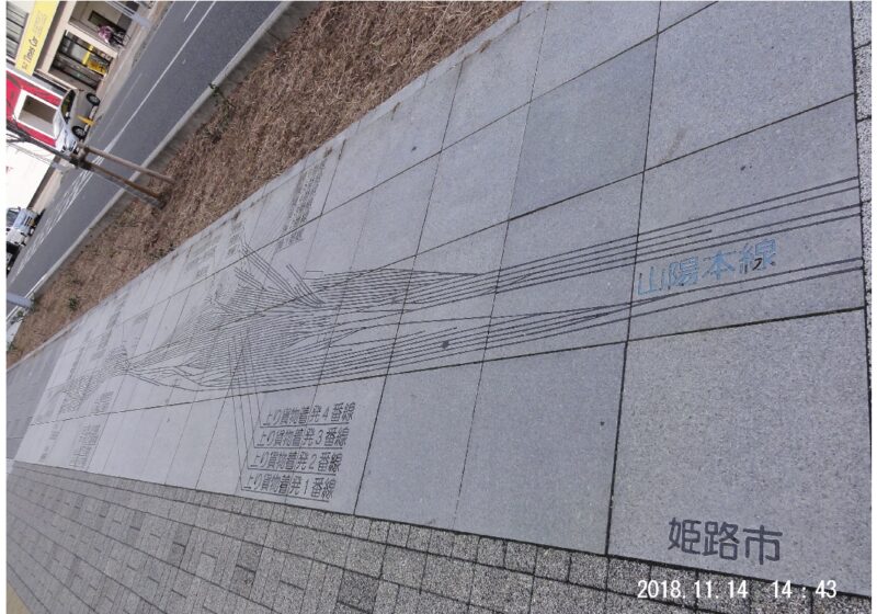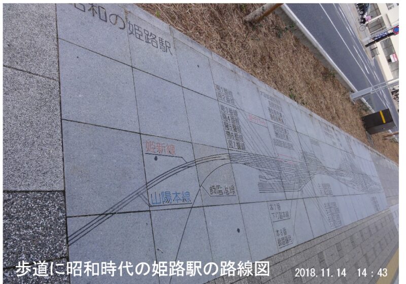 駅前の歩道には昭和時代の姫路駅の路線図がタイルになっていました。今の姫路駅と比べてみると面白いかも。初めて来たので昔の姫路駅を知らないのですが。