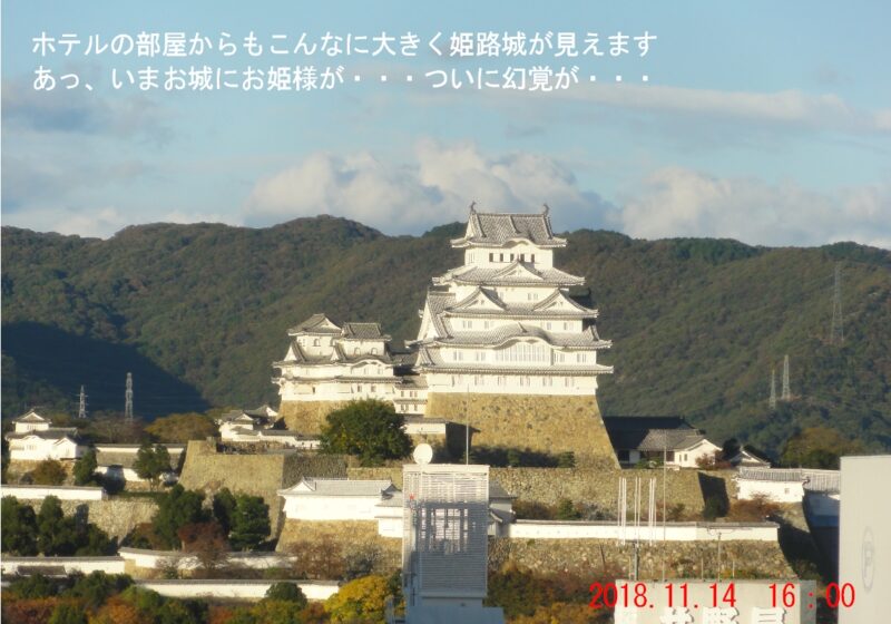 9階の部屋からはこんなに近くに姫路城が見えて、最高じゃん、いい部屋に泊まれた。