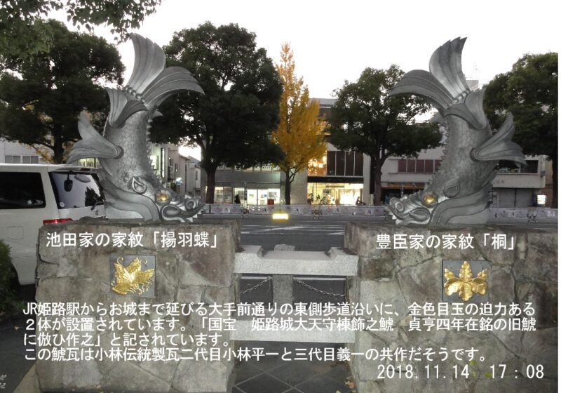 姫路駅から姫路城に向かって歩いていると、二体の鯱が、きっと姫路城の鯱ですよね。