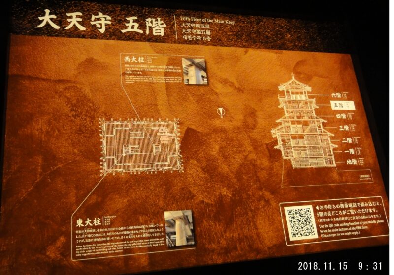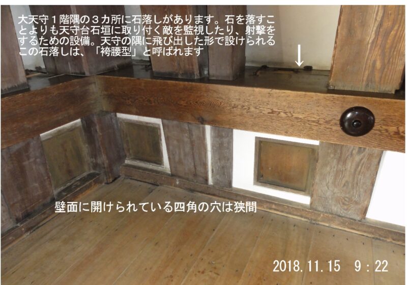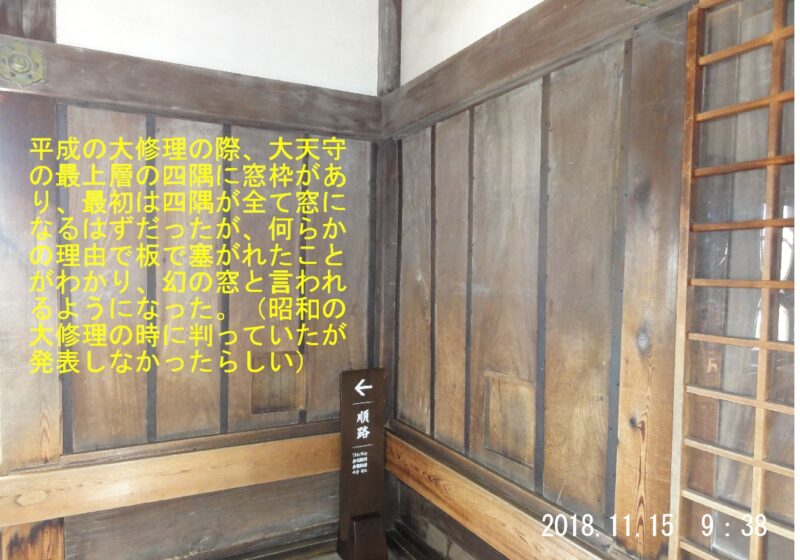 大天守の最上層にある四隅の外壁の中に敷居と鴨居(かもい)が計8組あり、窓になる予定だったことがわかった。四隅の窓を塞いだ理由は不明で、文献の記録も残っていないが、窓を作るより耐震性を優先したのではと考えられているそうです。
