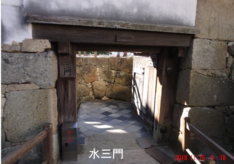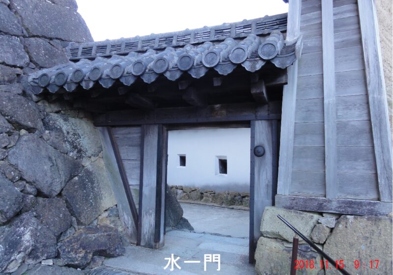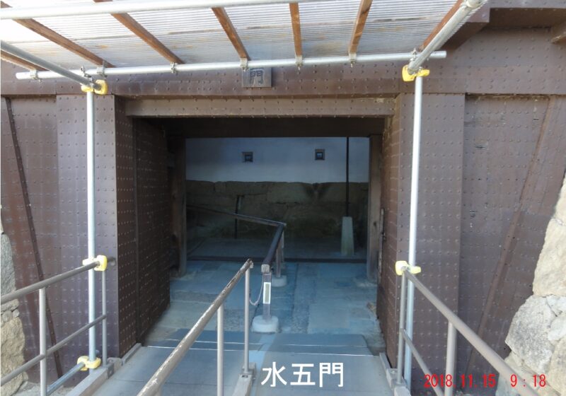 水の一門は城門としては異例の片開き扉になっており、この扉をくぐると下り坂になっている。