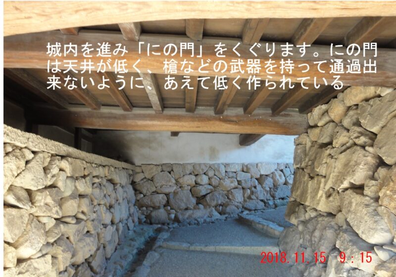 ますます狭く低い門になっている水の三門、甲冑を着用して武具を持っていると一度に多くの武士が通過できず、この先、直角に曲がって階段になっているのも防御のためなんだろうね。