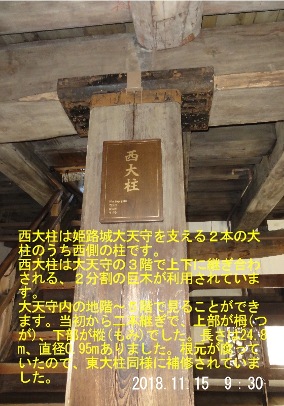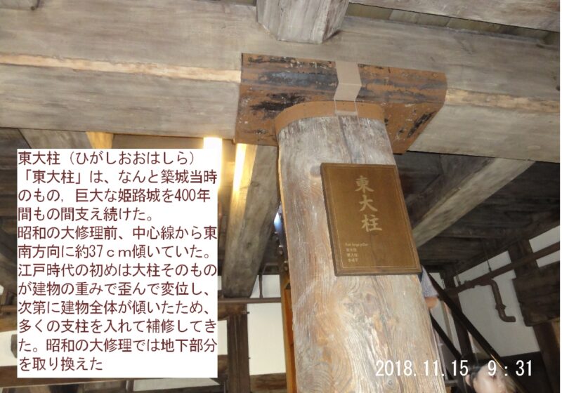 姫路城を支える二本の大柱、西大柱と東大柱は共に地階から伸び、重量約5700トンの大天守を支える。