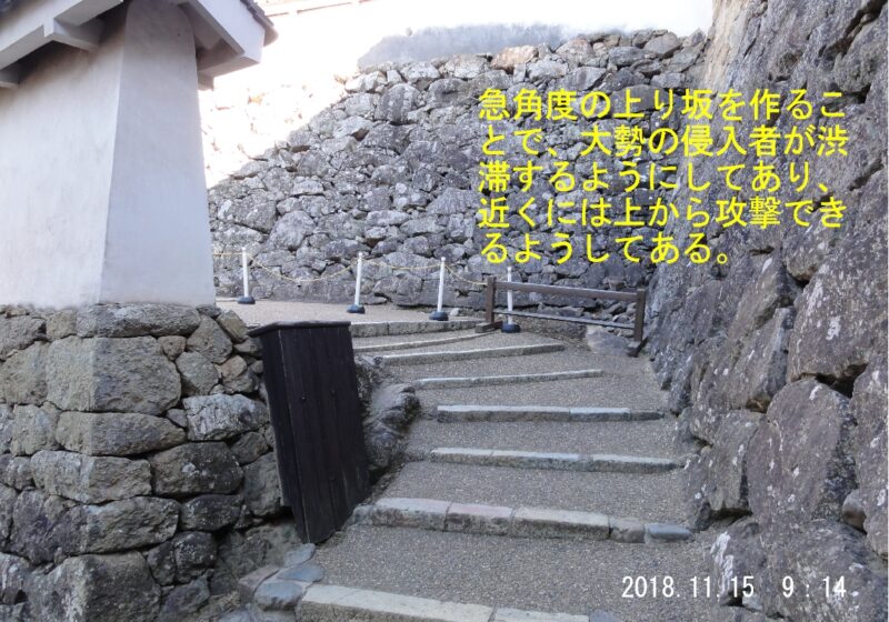 これは天守を目指して登って来たのに下り坂になることで、間違った道を進んだと思い込ませるためとか。(すげーそんなことまで考えてお城造るんだ、人間の心理を不安にさせる戦略)