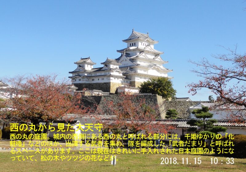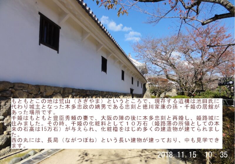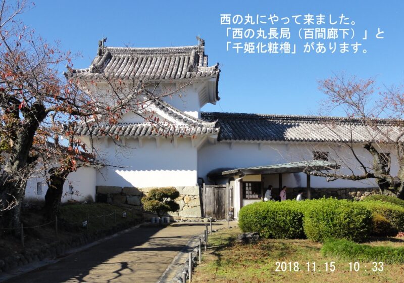 千姫は徳川家康の孫にあたり、姫路城にお輿入れの際、相当な持参金(化粧料・10万石)を持って来たらしい。(いやらしい話やな~10万石っていくらになるのか?大阪のおばちゃんやんか)その化粧料で造られたとされる西の丸に来ました。