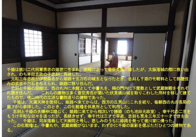 この化粧櫓は、中書丸や、武蔵御殿がないまま、わずかに千姫の面影を偲ぶただひとつの建物である。