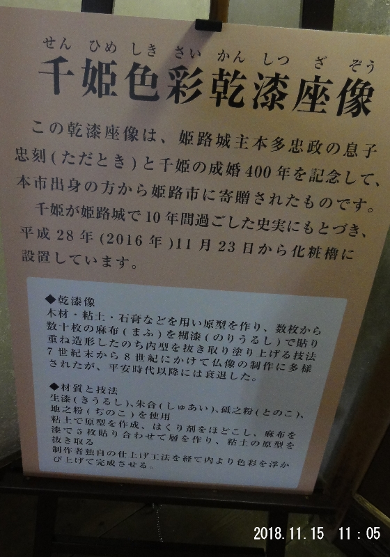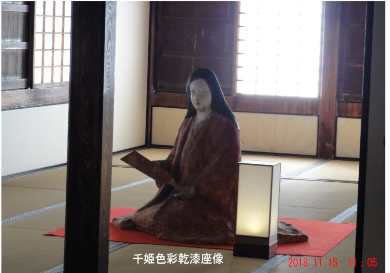姫路で今でも大切に祀られている千姫が、色彩乾漆座像で形になり愛されていることがわかります。制作したのは色彩乾漆彫刻家の「サブロウコスギ」氏、何だかすごい経歴がありそうな・・・