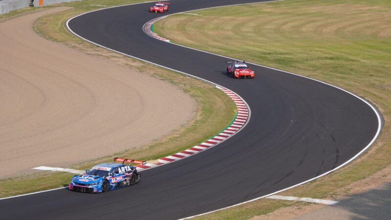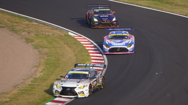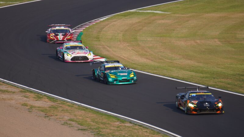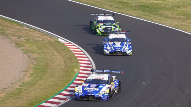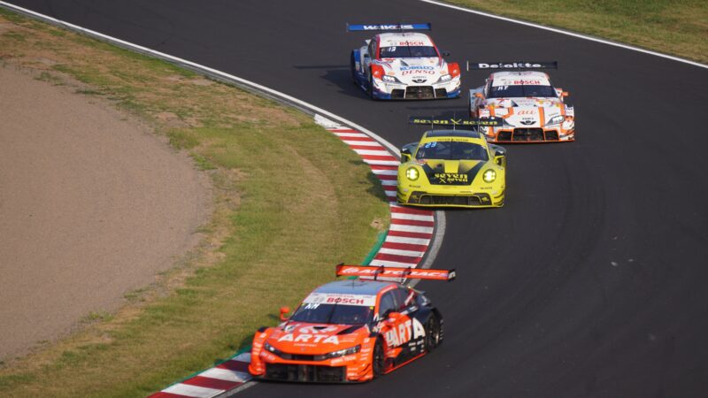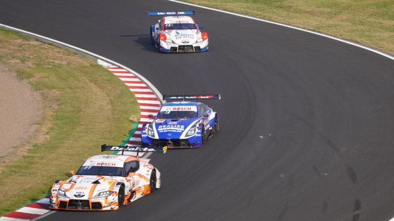 666号車の前にGT500の8号車 ARTAのHonda CIVIC TYPE R-GT(ドライバー・松下信治)、後ろにGT500の1号車 TGR TEAM au TOM’sのトヨタGRスープラ(ドライバー・山下健太)、その後方にGT500の39号車 TGR TEAM SARDのトヨタGRスープラ