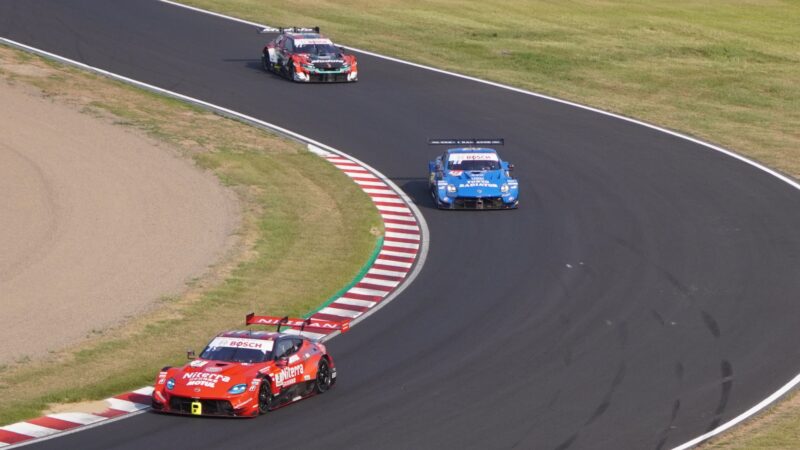GT500の3台 1号車 TGR TEAM au TOM’sのトヨタGRスープラ(ドライバー・山下健太)、24号車 KONDO RACINGのNISSAN Z NISMO GT500、39号車 TGR TEAM SARDのトヨタGRスープラ(ドライバー・関口雄飛)(2025.8.24 16:02)
