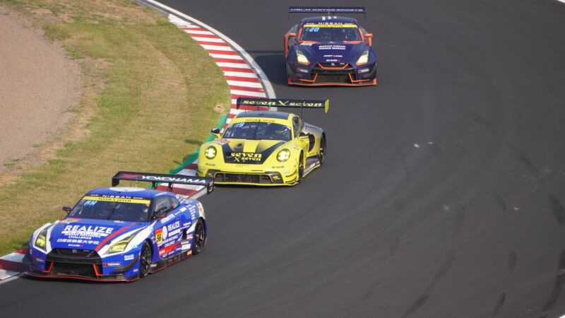 56号車 KONDO RACINGのGT-R NISMO GT3(ドライバー・平手晃平)、666号車 seven x seven Racingのポルシェ911 GT3 R、62号車 HELM MOTORSPORTSのGT-R NISMO GT3(2025.8.24 15:46)