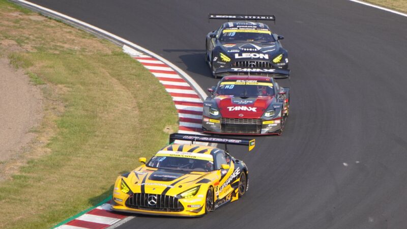 18号車 TEAM UPGARAGEのメルセデスAMG GT3(ハッチくん)、11号車 GAINERの日産フェアレディZ、65号車 K2 R&D LEON RACINGのメルセデスAMG GT3(2025.8.24 15:55)