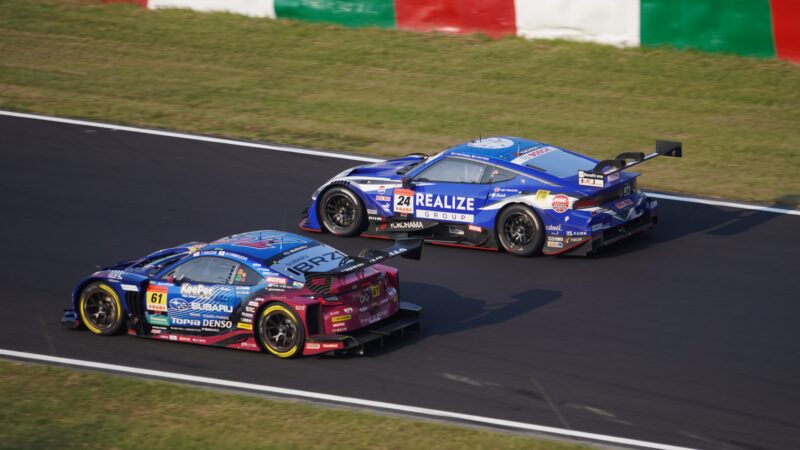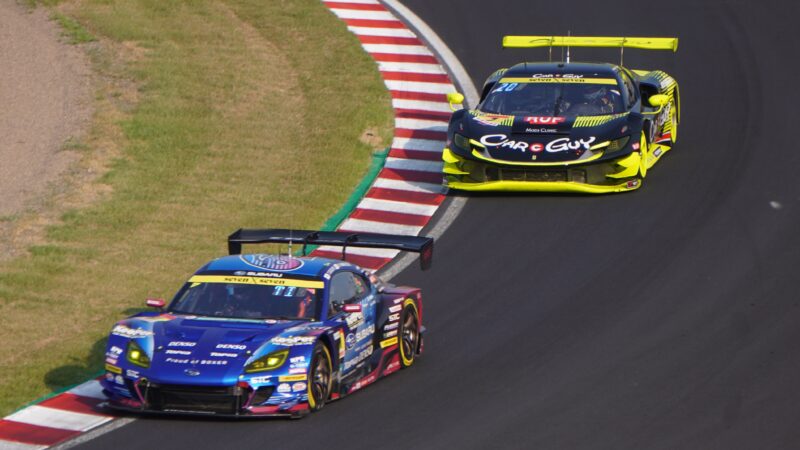 GT300クラスのトップ争いが続く、61号車 SUBARU BRZ(ドライバー・井口卓人)、7号車 CARGUYのフェラーリ296 GT3(ドライバー・ザック・オサリバン)(2025.8.24 16:07)