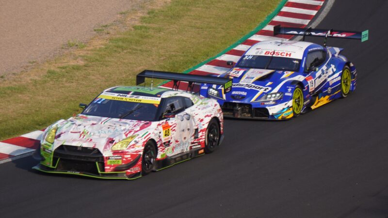 GT300の48号車 NILZZ RacingのNISSAN GT-R NISMO GT3(ドライバー・井田太陽)に迫る、GT500の19号車 TGR TEAM WedsSport BANDOHのトヨタGRスープラ(ドライバー・国本雄資)