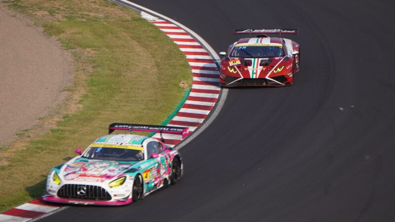 0号車JLOCのランボルギーニ・ウラカンGT3 EVO2(ドライバー・元嶋佑弥)はまだ元気に、4号車 GOODSMILE RACING & TeamUKYOのメルセデスAMG GT3を追走してました。次の周回で来ないと心配になります。(2025.8.24 16:09)