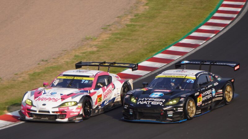 GT300同士のサイドバイサイド。25号車 HOPPY team TSUCHIYAのトヨタGRスープラGT(ドライバー・松井孝允)と2号車 HYPER WATER Racing INGINGのトヨタGR86 GTの戦い、トヨタのスープラと86ですが、中身は市販車と全く違う。(2025.8.24 16:10)