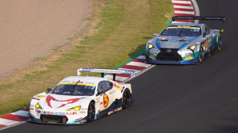 GT300の戦い 5号車 TEAM MACHのトヨタ86 MC(GT300の2位)、60号車 LM corsaのレクサスLC500 GT(ドライバー・河野駿佑)(2025.8.24 16:13)
