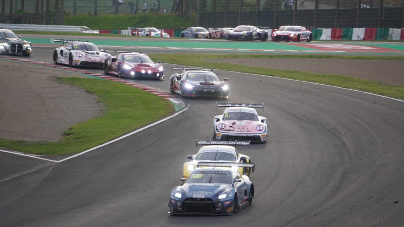 よく見ると、24号車KONDO RACINGのリアライズコーポレーション ADVAN ZはGT500の13位、後ろの11号車GAINERのGAINER TANAX ZもGT300の13位で、同じ13位同士で走っている。(2025.8.24 17:16)