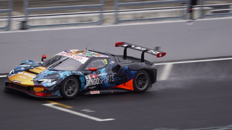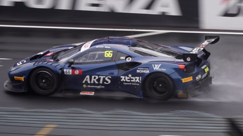 ホームストレートを通過する、1号車(GT3/Am)Team MACCHINA フェラーリ296 GT3(植松忠雄/鈴木宏和)コース上はウェットだが、スタート時に比べて水煙の量が少なくなってきている。(2025.9.13 14:35)