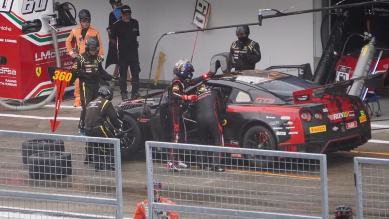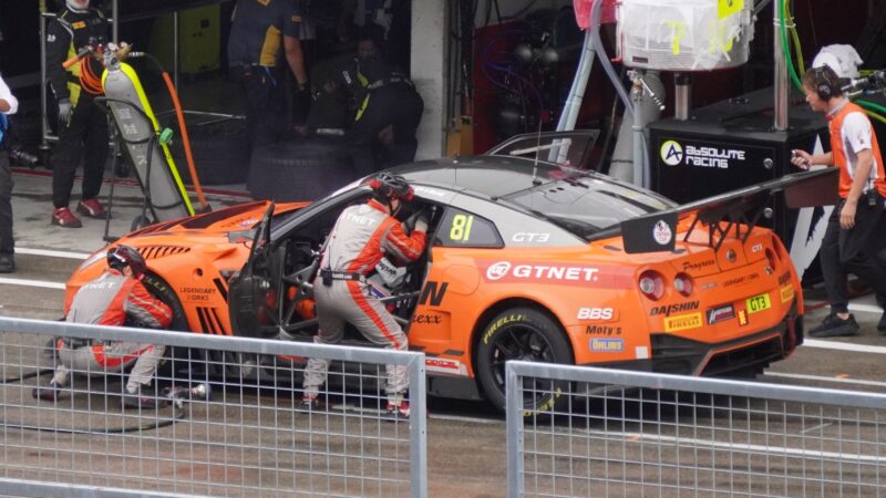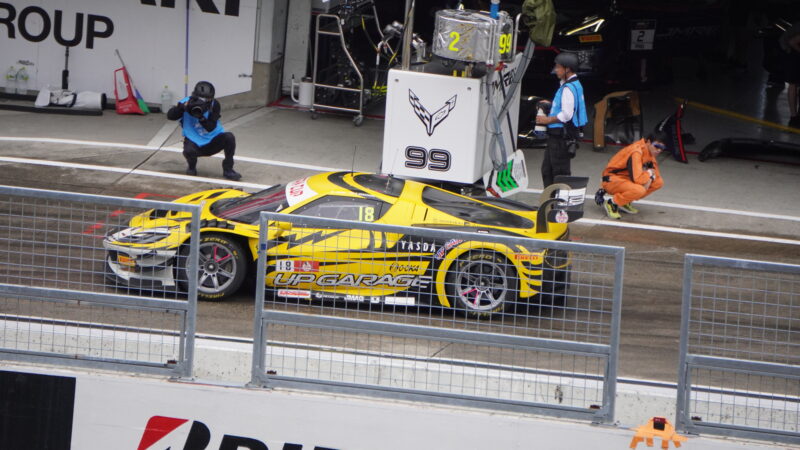 各チーム早めにピットインして作業を行う中、18号車 TEAM UPGARAGE with ACRはドライバーAKITAがギリギリまでレインタイヤでひっぱり、スリックタイヤに交換、ドライバーを小林崇志に交代。(2025.9.13 14:29)