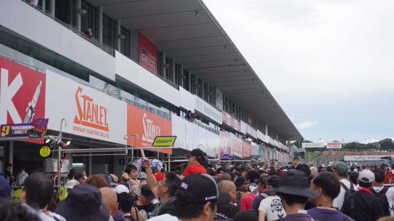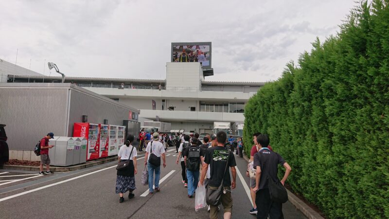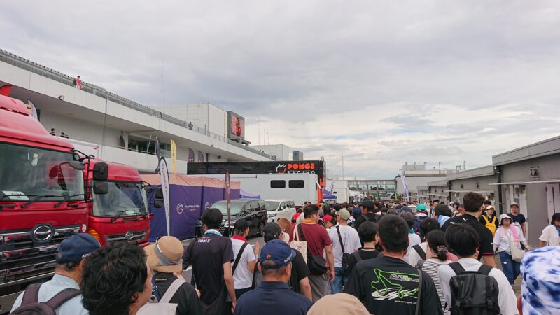 パドックの裏側に来るとすでにすごい人で渋滞してますが、少しずつ進んでいきます。