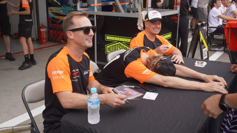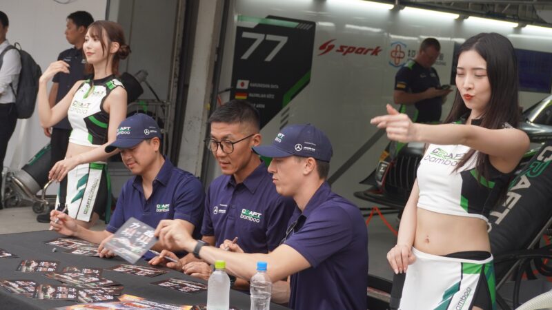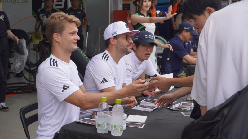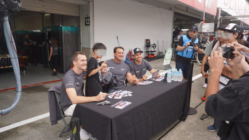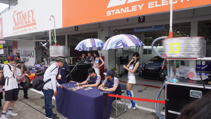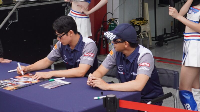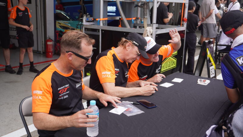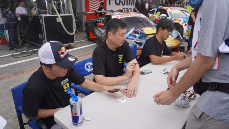 左から、笹原右京選手、武井真司選手、伊東黎明選手のサイン会(武井選手は株式会社BINGOの代表取締役であり、現役レーサーです。)