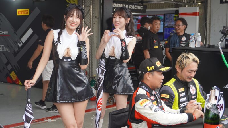 ジャパンカップ レース1で3位になった、296号車 Hitotsuyama with Cornes Racingのレースアンバサダー(左から河村澪さん、寺地みのりさん)