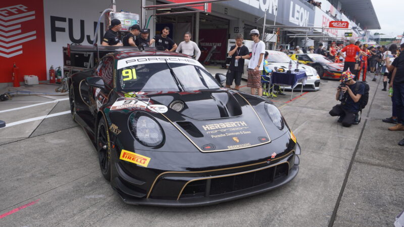 黒いボディに金色のストライプがカッコイイPorsche、昔の「John Player Special」みたい。(2025 IGTC第4戦鈴鹿1000km出場車両)