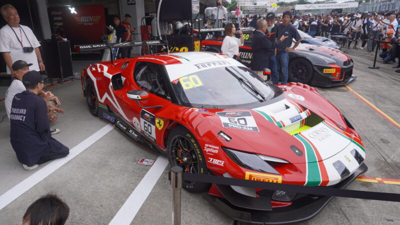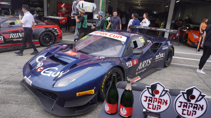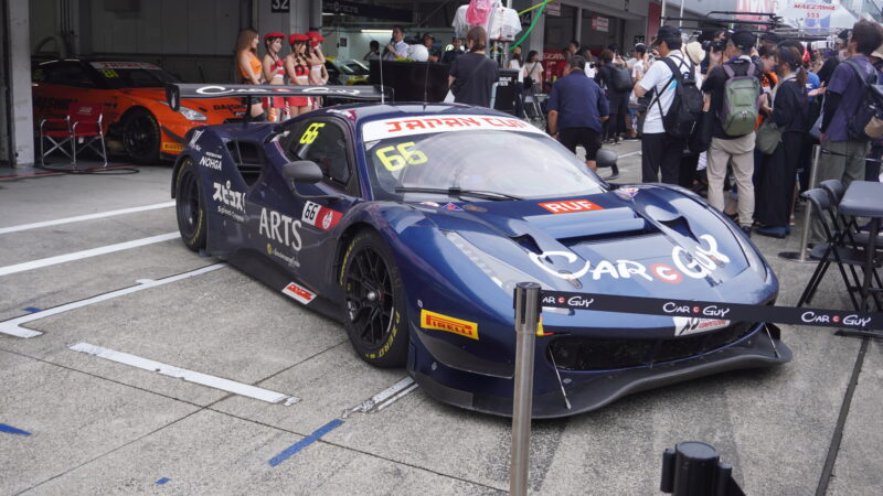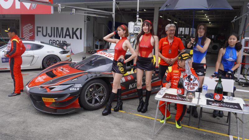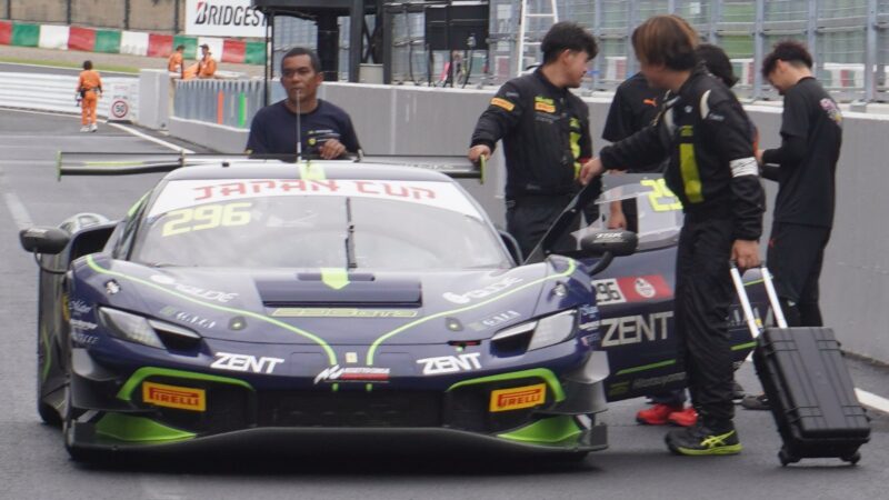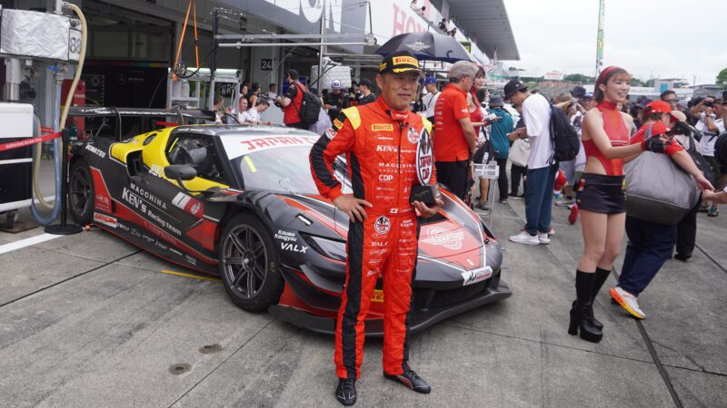 フェラーリの前に立つのは植松忠雄選手、植松選手は2022、2024年のJapan Cup GT3 Amクラスチャンピオン(SROジャパンカップ出場車両)