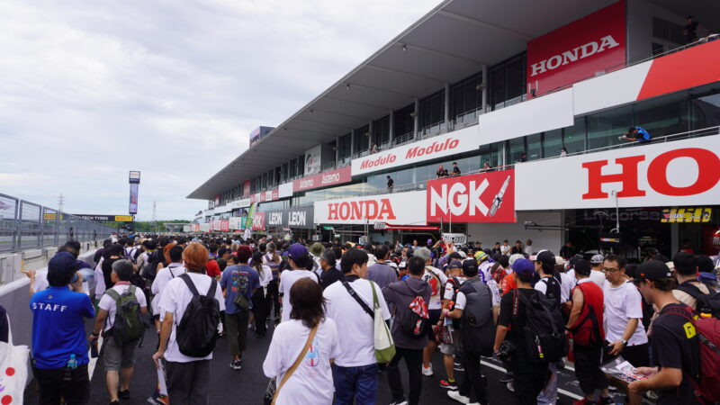 ピットウォークの終了の時間が来ました。次の予定があり、係員も早くコースを確保しなければならないので、大急ぎで観客をコース外に誘導します。